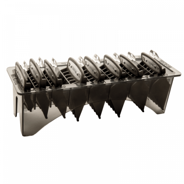 Package includes (8) Premium Black Cutting Guides (#3171-500) – 1/8”, 1/4”, 3/8”, 1/2”, 5/8”, 3/4”, 7/8”, and 1” and comb tray. Secure, smooth, and precise, the Premium Cutting Guides are a must-have for every busy barber or stylist.