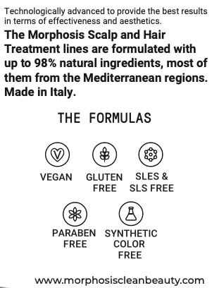 Technologically advanced to provide the best results in terms of effectiveness and aesthetics. The Morphosis Scalp and Hair Treatment lines are formulated with up to 98% natural ingredients, most of them from the Mediterranean regions. Made in Italy.