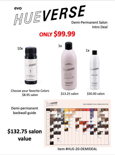 *** to place your order, pick your 10 favorite hueverse demi-permanent colors and add to your online order. You will only be charged the cost of the intro at the time we invoice.